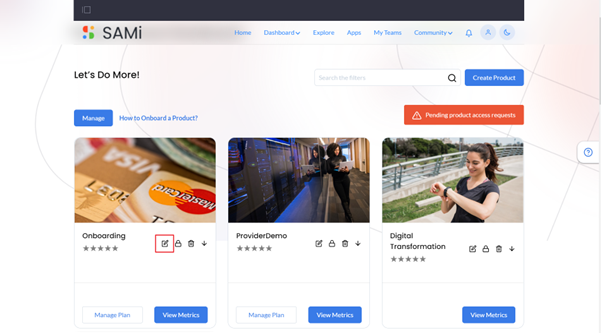 The SAMi update product feature helps the PO persona to edit, delete, or set permissions to an existing product in the SAMi portal.
